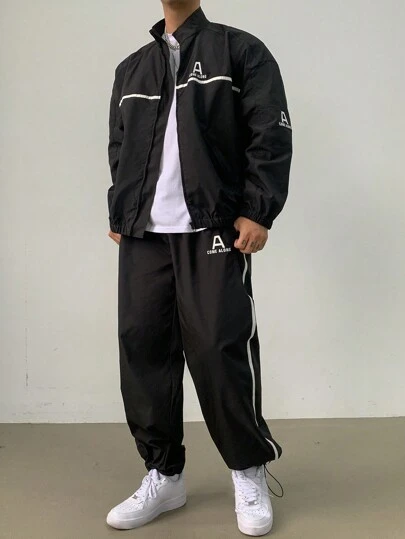 DAZY 男士字母印花条纹拼接夹克套装,秋季 - 黑色 - 查看 1