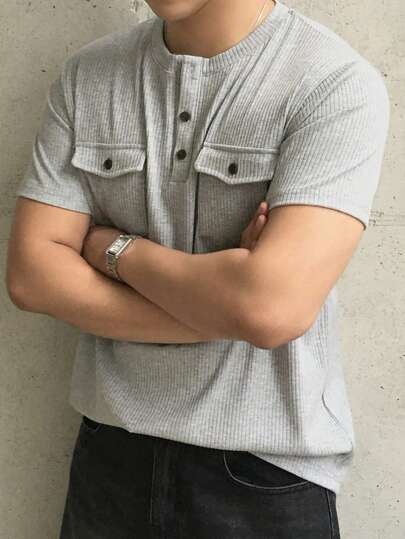 DAZY 男士夏季口袋设计圆领半开襟T恤 - 灰色 - 查看 4