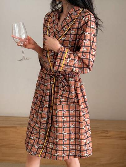 DAZY 格子图案快乐小狗印花撞色滚边披肩领中长款女士睡袍 - 橘色 - 查看 1