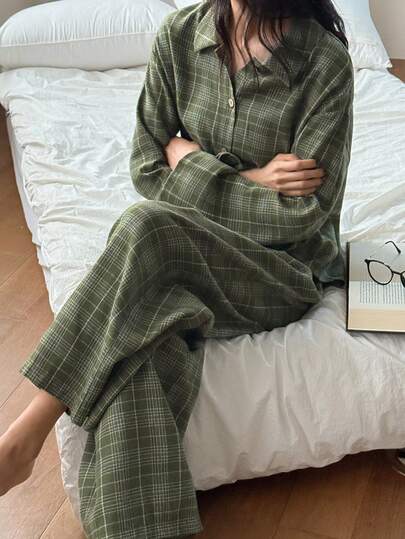 DAZY 格子宽松睡衣套装(女款),衬衫和裤子两件套。 - 軍綠色 - 查看 2