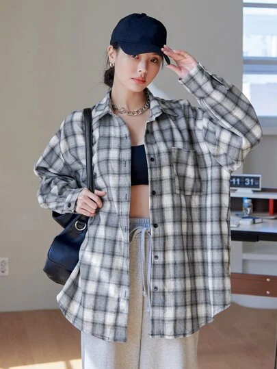 DAZY 格紋印花下垂肩過大襯衫 - 彩色 - 查看 1