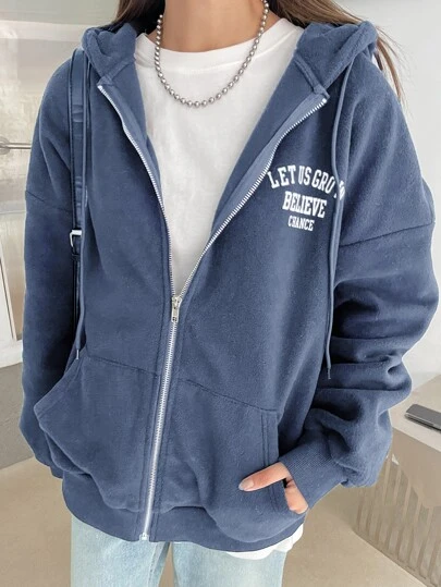 DAZY 标语图案落肩拉链抽绳连帽羊毛夹克,秋季女装 - 藍色 - 查看 1