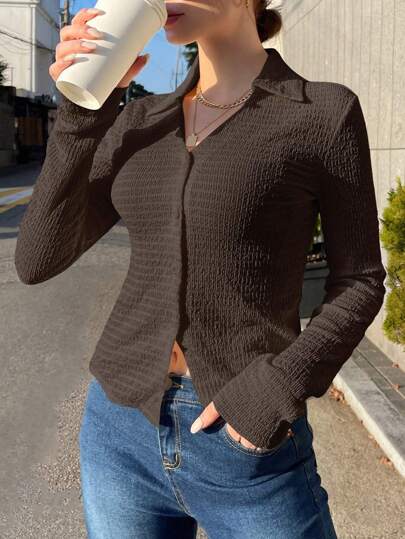 DAZY 纯色纽扣前开衬衫长袖上衣 - 咖啡棕 - 查看 1