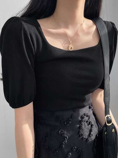 DAZY 方領泡泡袖條紋針織T恤 - 黑色 - 查看 1