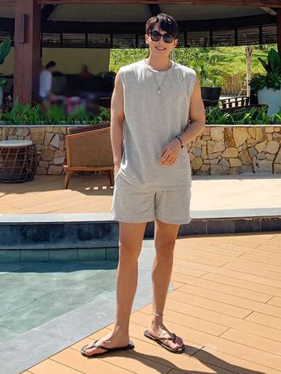 DAZY 夏季纯色浅灰色男士背心套装 - 淺灰色 - 查看 6