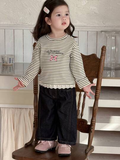 DAZY 女童圆领条纹蝴蝶结字母印花休闲上衣,春秋季 - 杏色 - 查看 1