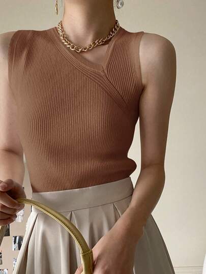 DAZY 女士不对称领纯色无袖商务休闲针织上衣 - 咖啡棕 - 查看 1