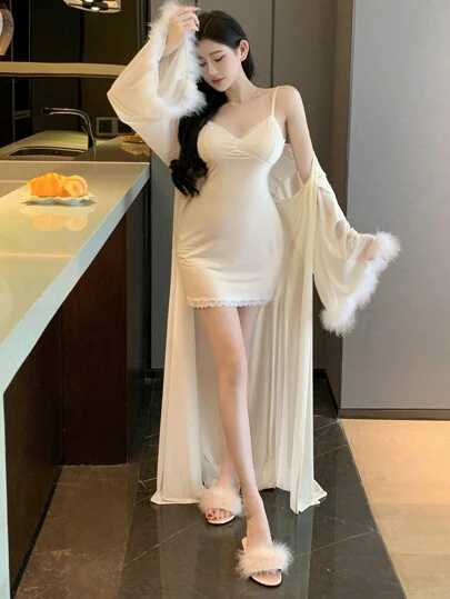 DAZY 女士长袖网眼毛绒袖口家居服睡袍睡衣 - 米色 - 查看 1