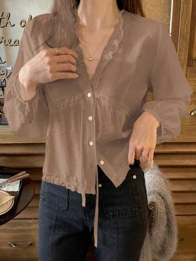 DAZY 女士纯色荷叶边 V 领灯笼袖白色衬衫,春秋长袖上衣 - 卡其色 - 查看 1