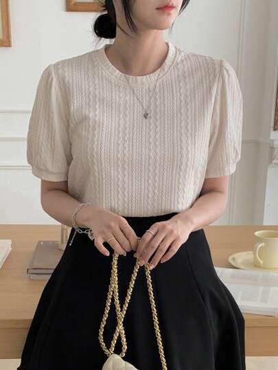 DAZY 女士夏季圆领优雅通勤百搭休闲短袖T恤 - 米色 - 查看 1