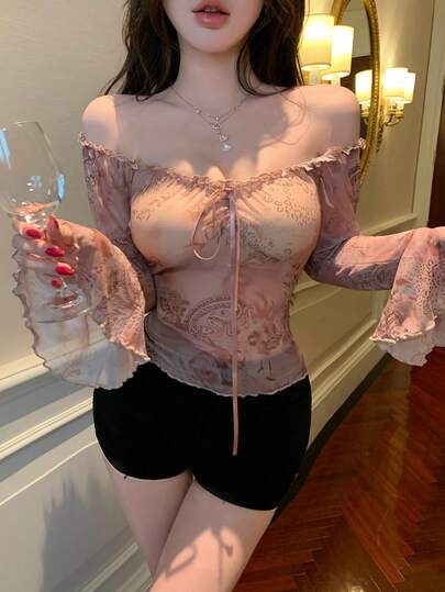 DAZY 女士全身碎花透视网纱露肩长袖上衣外出上衣 - 粉色 - 查看 9