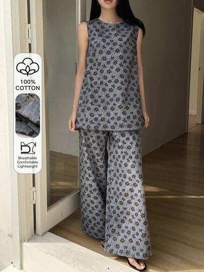 DAZY 女士印花圆领无袖背心和长裤休闲牛仔套装,波西米亚风