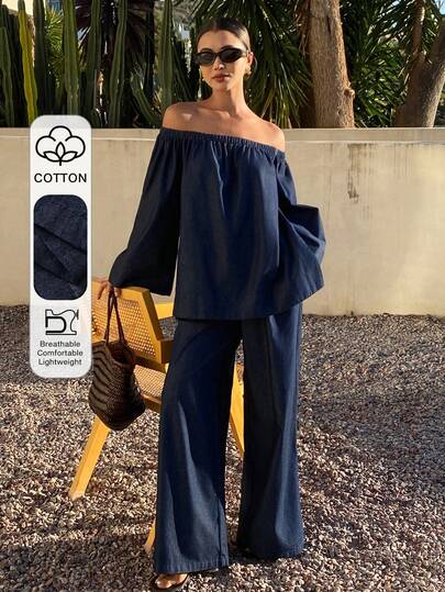 DAZY 女士休闲露肩上衣和阔腿牛仔裤套装,春夏款 - 藍色 - 查看 1