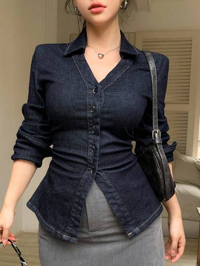 DAZY 女士翻领长袖收腰开衩下摆休闲优雅牛仔衬衫 Y2k - 深色水洗藍 - 查看 1
