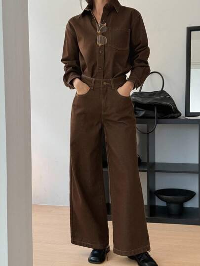 DAZY 女式长袖衬衫和宽松长裤两件套休闲牛仔套装