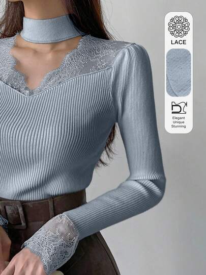 DAZY 女士撞色蕾丝镂空修身长袖毛衣,白色,春秋季 - 藍色 - 查看 1