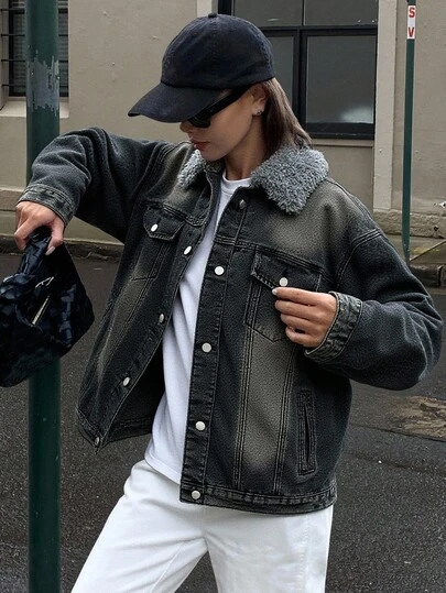 DAZY 女士蓬松拼接前扣口袋长袖常规款外套,带保暖内衬,冬季女式外套 - 深灰色 - 查看 1