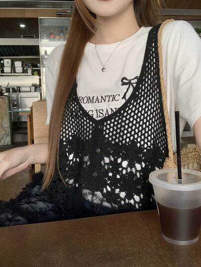 DAZY 女士拼接蝴蝶结网纱纽扣V领无袖迷你连衣裙 - 黑色 - 查看 1