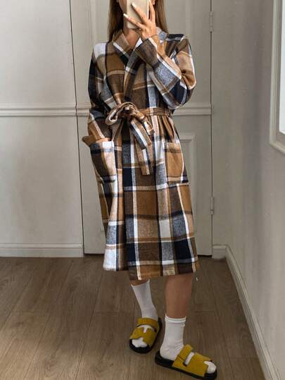 DAZY 女士格子印花翻领宽松长袖睡袍,春秋季睡衣 - 棕色 - 查看 1