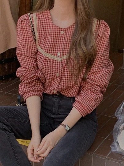 DAZY 女士格子衬衫、长袖上衣 - 紅色 - 查看 1