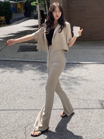 DAZY 女士纯色短夹克和喇叭裤套装,春夏季商务休闲装 - 杏色 - 查看 1