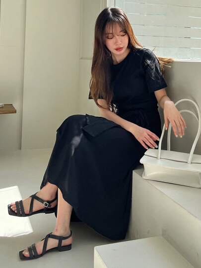 DAZY 女式纯色圆领抽绳腰修身中长连衣裙,黑色,春夏,休闲女装