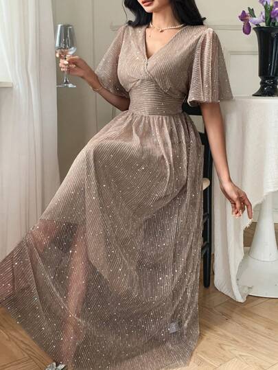 DAZY 女士V领亮面收腰中长连衣裙舞会礼服 - 金色 - 查看 1