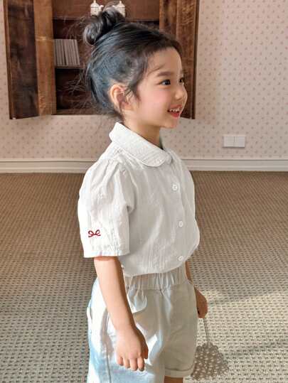 DAZY 年轻女孩秋季可爱蝴蝶结短袖衬衫 - 米色 - 查看 1