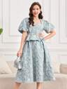 SHEIN 优雅绿色中长款星月印花分层连衣裙,适合开斋节、国庆节,可爱的休闲连衣裙