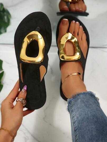女士豹纹印花一脚蹬人字拖,金属扣装饰舒适平底沙滩凉鞋 - 黑色 - 查看 1