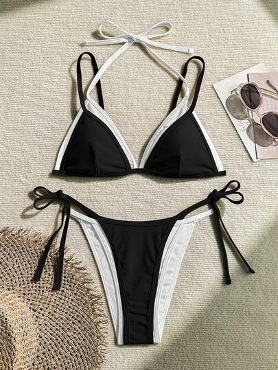 全新撞色系带性感吊带比基尼套装 - 黑色 - 查看 1