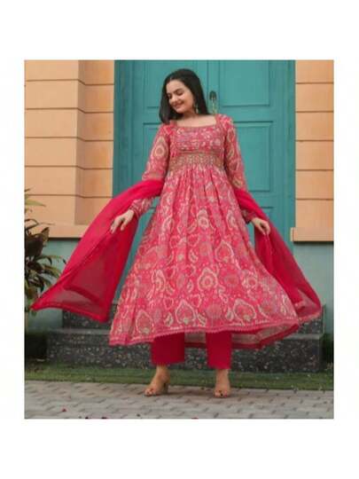 Dark Coral Pink Plus Size Anarkali Suit Set - 珊瑚粉 - 查看 1