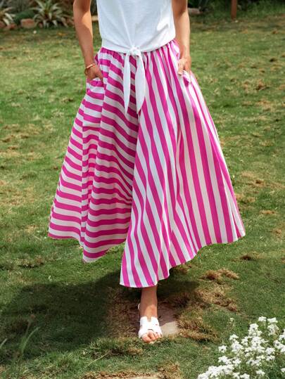 Dayvera 女士夏季休闲优雅粉白条纹高腰A字长裙,适合度假沙滩,带口袋,粉白野餐裙