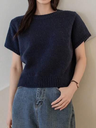 Dazy-Less 女士商务休闲纯色短袖针织上衣 - 藏蓝色 - 查看 1