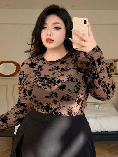 Dazy Plus 圆领植绒弹力修身女上衣,春夏长袖女上衣 - 咖啡棕 - 查看 1