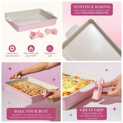 Deluxe Roasting Pan Set, Heavy Duty Nonstick Bakeware With Silicone Handle Grips, 13 Inchx9 Inch, Pink - 粉色 - 查看 1