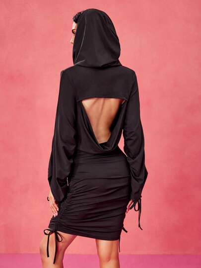 Tristan Blake 设计师款黑色拉绳喇叭袖围脖垂坠连帽迷你连衣裙,适合节日、音乐会服装、舞会礼服 - 黑色 - 查看 4
