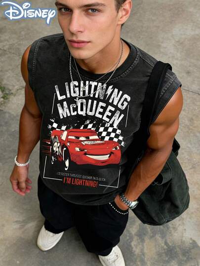 6. Disney Officially Licensed Sleeveless Graphic Tees, 100 Percent Cotton, Cars I'm Lightning Sleeveless T-Shirt, Men's, Washed 230g, Retro Vintage, Crew Neck, Comfortable
