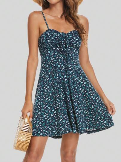 小碎花正面花卉抽繩吊帶洋裝 - 綠色 - 查看 1