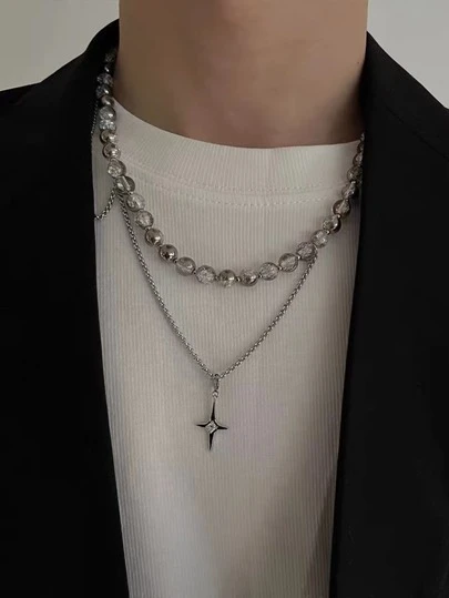 雙層珍珠和星星項鍊帶甜美風和酷冰水晶串珠鏈條 - 銀色 - 查看 1