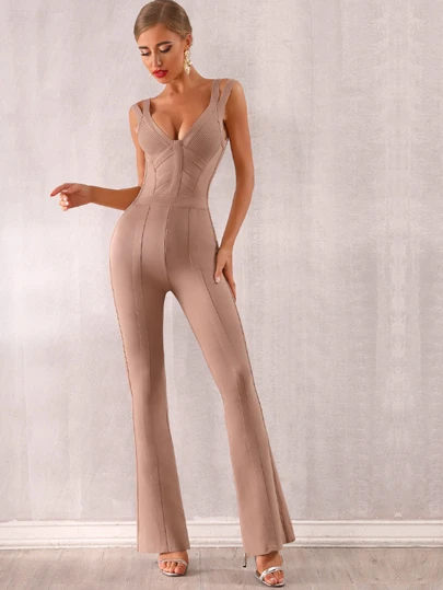 雙帶傘狀腿窄身連身長褲 - 杏色 - 查看 4