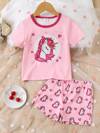 年轻女孩独角兽和心形印花对比色睡衣套装