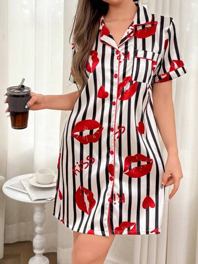 SHEIN 女士缎面条纹领睡裙娃娃衫,饰有嘴唇和爱心印花,奢华舒适,细节优雅,哞哞睡衣 - 白色 - 查看 1