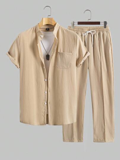 EGENSIO 男士立领短袖口袋衬衫和裤子套装两件套衬衫套装,舒适服装 - 卡其色 - 查看 1