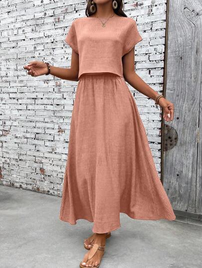 EMERY ROSE 2件套女士纯色短袖衬衫和迷你裙套装 - 橘色 - 查看 2