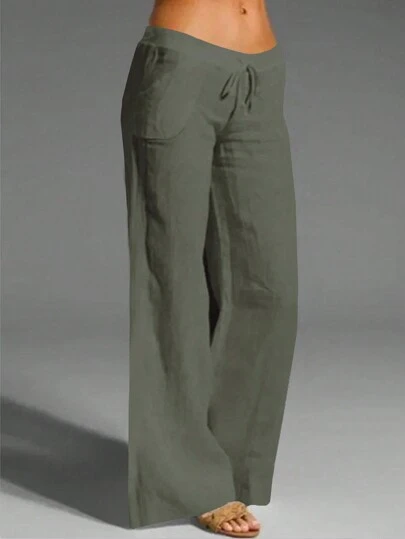 EMERY ROSE 休閒實色束腰寬腿褲 - 軍綠色 - 查看 1