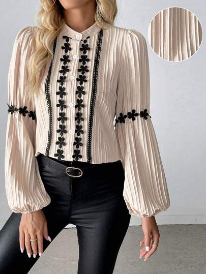 EMERY ROSE 优雅简约H型灯笼袖立领蕾丝拼接纹理波浪条纹长袖常规上衣,秋冬 - 杏色 - 查看 1