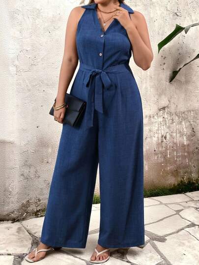 EMERY ROSE 优雅夏季通勤连体裤,适合大码女性,包括大码牛仔连体裤、蓝色牛仔连体裤、无袖连体裤、度假连体裤、宝蓝色连体裤、系带连体裤等。 - 藍色 - 查看 1