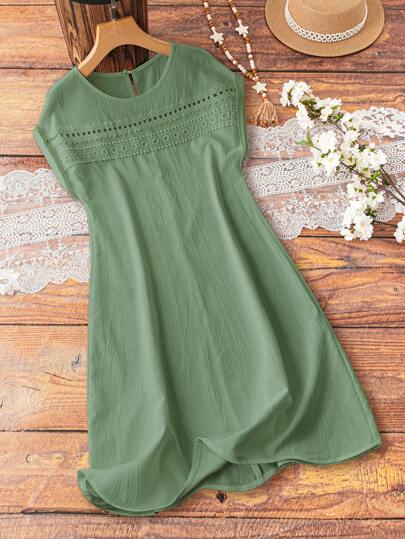 EMERY ROSE 镂空花卉蕾丝拼接纹理粘胶混纺 H 型落肩袖女式连衣裙 - 綠色 - 查看 1