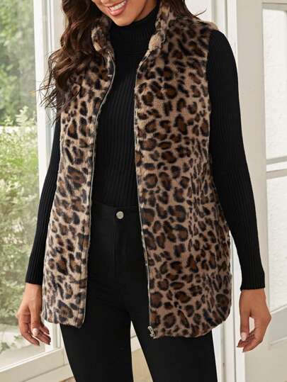 EMERY ROSE 秋冬豹纹拉链背心毛绒外套 - 彩色 - 查看 1